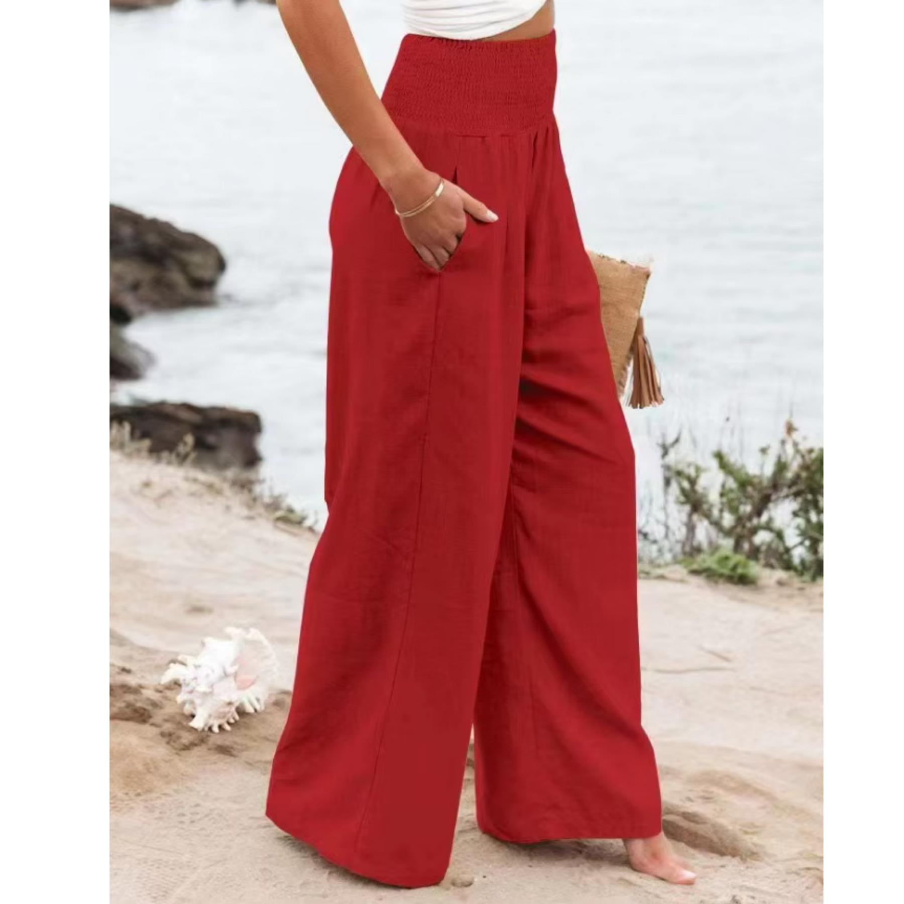 The cotton and linen blend offers the perfect balance between softness and structure. It allows airflow on warmer days while maintaining a beautiful drape. The wide leg cut enhances comfort and creates that relaxed, coastal inspired look that feels both feminine and refined.